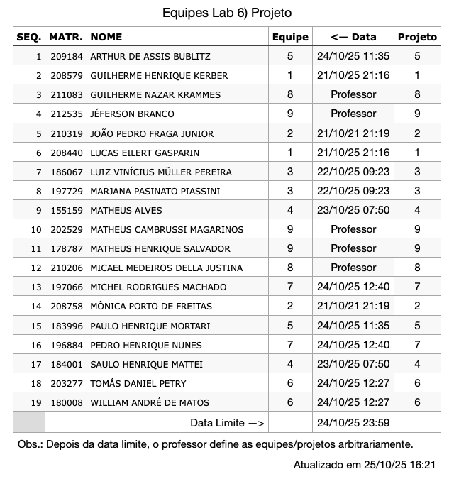 Equipes confirmadas para lab 6) Projeto —> clique [aqui]. Data limite: 24/10/2025 23:59.